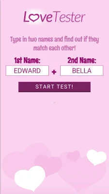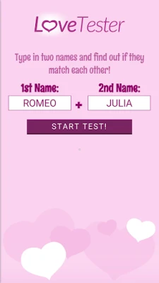 Features of our free Love Calculator: - Compatibility test for you and your heart-throb - Love Tester will scan your names - Date or no Date? - Lots of advice and sayings - True love or only friend zone? - Lots of fun